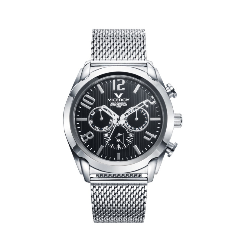 Reloj de hombre Viceroy multifunción, destaca por su diseño con caja y malla milanesa de acero, combinando elegancia y funcionalidad. Su esfera y contadores en negro contrastan con los indicadores en plateado, ofreciendo un estilo sofisticado y contemporáneo que se adapta a cualquier ocasión con estilo.