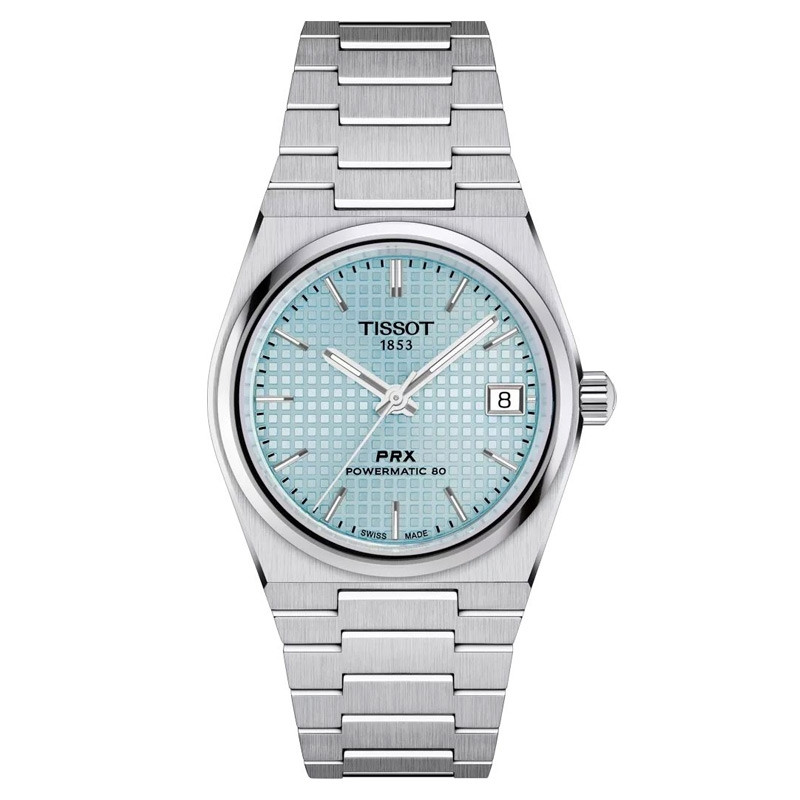 Tissot PRX 35mm Powermatic 80, donde la estética atemporal se encuentra con la tecnología contemporánea. Este reloj de 35 mm exhibe una caja de acero de alta calidad y una vibrante esfera azul hielo. Este tono de moda proyecta un matiz exquisito, captando y reflejando perfectamente la luz. El distintivo diseño de la esfera en forma de gofre añade una sofisticación única a este modelo automático. Equipado con una resistencia al agua de hasta 100 metros y una espiral de equilibrio Nivachron™, el PRX ice blue se convierte en una opción seductora para los entusiastas de los relojes prácticos y con estilo. El brazalete de acero satinado, completado con un cierre desplegable de acero de triple hoja, garantiza un ajuste impecable. Demuestre su gusto con el Tissot PRX 35mm Powermatic 80 en azul hielo.